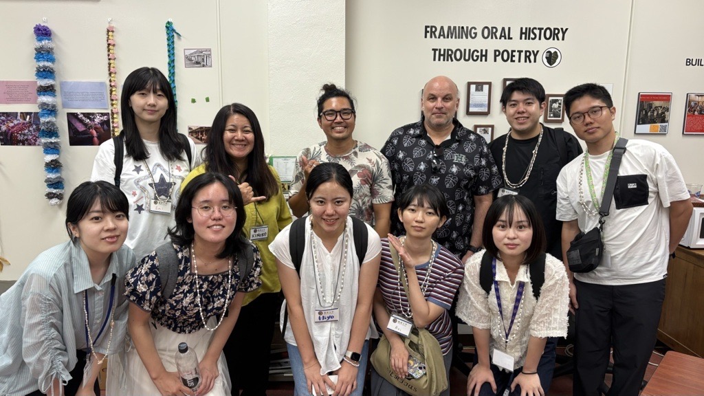 今年度で3回目となるハワイ研修では、連携校であるハワイ大学ヒロ校(University of Hawai‘i at Hilo)を主な派遣先とし、ハワイの歴史・文化および言語継承について学びました。現地では、すべてハワイ語で授業が行われているHulaの授業の見学・体験やハワイ語の教科書や絵本を作成している教材センターを訪問し、ハワイ語教育の現場について理解を深めるとともに、言語継承に向けた地域社会と教育機関の連携の重要性について学ぶ機会となりました。また、派遣学生たちは受入研修で実施した「食」に関するワークショップを現地でも開催し、沖縄の食文化について現地学生とディスカッションを行いました。最後に行ったカルタ対決では、学生同士が大いに盛り上がり、白熱した戦いが繰り広げられました。
